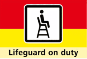 Als deze rood-gele vlag is gehesen, dan mag je gewoon de zee in. De reddingspost is geopend in het gebied tussen deze vlaggen. Watersporten op deze plek is niet toegestaan, omdat er zwemmers in zee zijn.